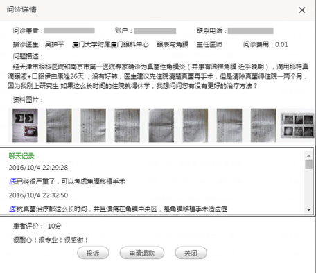 眼科醫(yī)院和南京第一醫(yī)院專(zhuān)家確診為真菌性角膜炎,并患有圓錐角膜近乎晚期,使用相關(guān)藥物沒(méi)有好轉(zhuǎn),江西當(dāng)?shù)氐尼t(yī)生建議其先住院清除真菌再手術(shù)。因?yàn)榍宄婢米≡阂粌蓚€(gè)月,剛上研究生的他如果長(zhǎng)時(shí)間住院就得休學(xué),實(shí)在進(jìn)退兩難的他,通過(guò)眼科通APP接通了廈門(mén)眼科中心眼表與角膜專(zhuān)科的學(xué)科帶頭人吳護(hù)平主任的問(wèn)診服務(wù),盡管已經(jīng)22:30,吳護(hù)平主任還是耐心解答了他的疑問(wèn),并且給出了盡快做角膜移植手術(shù)的建議。因?yàn)閺B門(mén)眼科中心有與華廈眼科醫(yī)院集團(tuán)下各地的眼庫(kù)聯(lián)動(dòng),所以患者很快就有角膜材料。吳護(hù)平30分鐘內(nèi)的4個(gè)答復(fù)就大大緩解了小雷的焦慮,避免了休學(xué)危機(jī),他連連道謝并打算盡快接受手術(shù)。