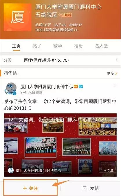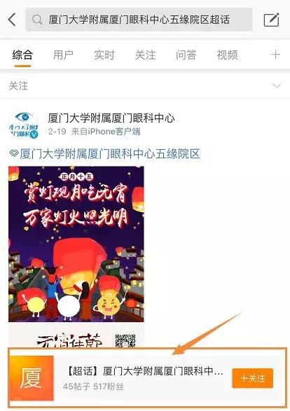 ?、俅蜷_新浪微博,點(diǎn)擊“發(fā)現(xiàn)”,搜索“廈門大學(xué)附屬廈門眼科中心五緣院區(qū)”;