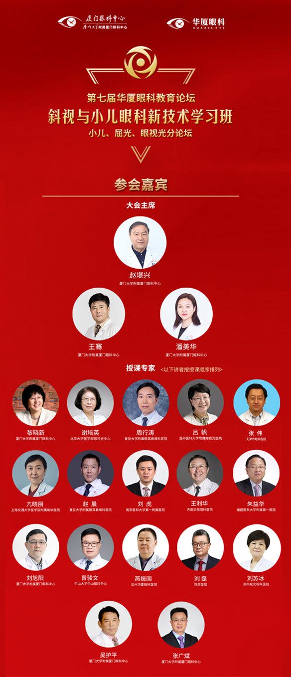 巔峰聚首,百家爭鳴!10月18日-21日,由廈門大學(xué)附屬廈門眼科中心主辦的“斜視與小兒眼科新技術(shù)學(xué)習(xí)班暨第七屆華廈眼科教育論壇小兒、屈光、眼視光分論壇”云端際會,精彩盛放。本屆論壇由47名大咖學(xué)者領(lǐng)銜主講,匯集國內(nèi)眼科領(lǐng)域金字塔尖專家,為我們帶來智慧激蕩的高峰論劍。大會主席:國際眼科科學(xué)院院士、華廈