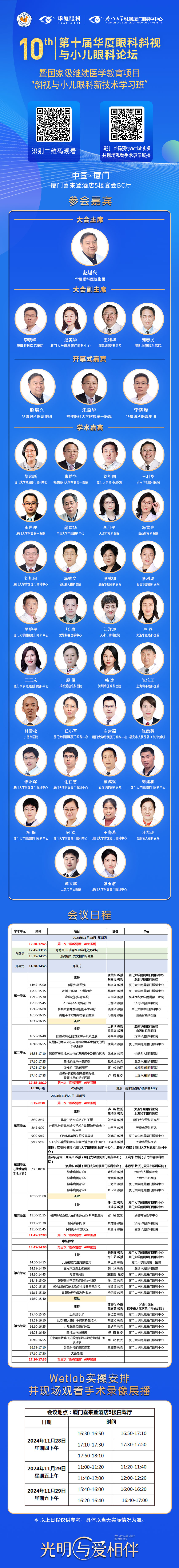 本屆會議主席由國內(nèi)斜視與小兒眼科界領(lǐng)軍人、華廈眼科醫(yī)院集團專家委員會主席趙堪興教授及廈門大學(xué)附屬廈門眼科中心業(yè)務(wù)副院長潘美華教授、李曉峰教授、王利華教授、劉春民教授共同擔(dān)任,會議榮幸地邀請到眾多國內(nèi)著名專家強勢助陣。